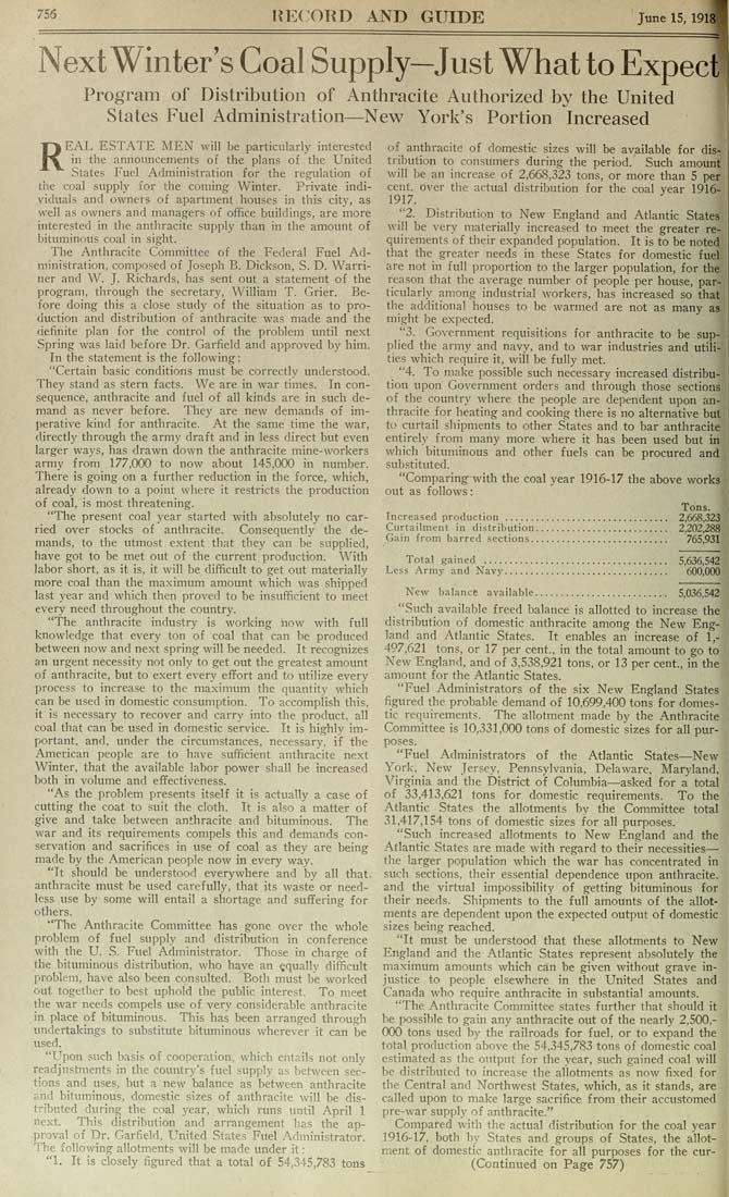 756 l?E( ORD AND GUIDE June 15, ,191^ Next Winter's Coal Supply—Just What to Expect Program