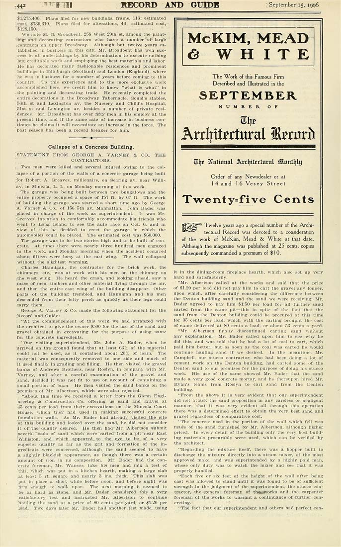 of a concrete garage being built ;fbr-'Robert A. Greaves, millionaire, on Searing av, near Willi-s av,' iri Mine
